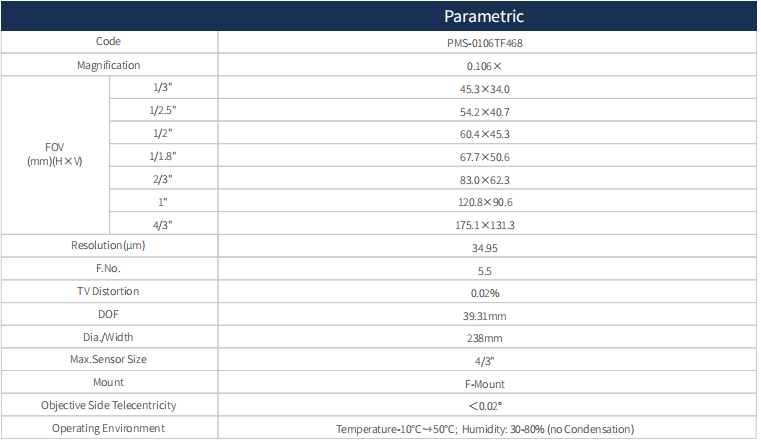 This F Mount Big FOV Telecentric Lens PMS-0106TF468, 0.106X, Max. sensor size 4/3", WD 468mm.