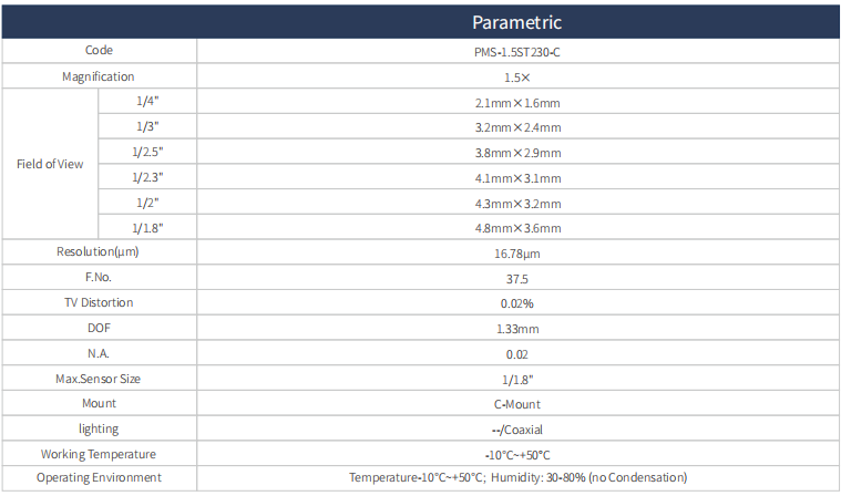 This Standard Telecentric Lens 1.5X, Max. sensor size 1/1.8", WD 230mm.