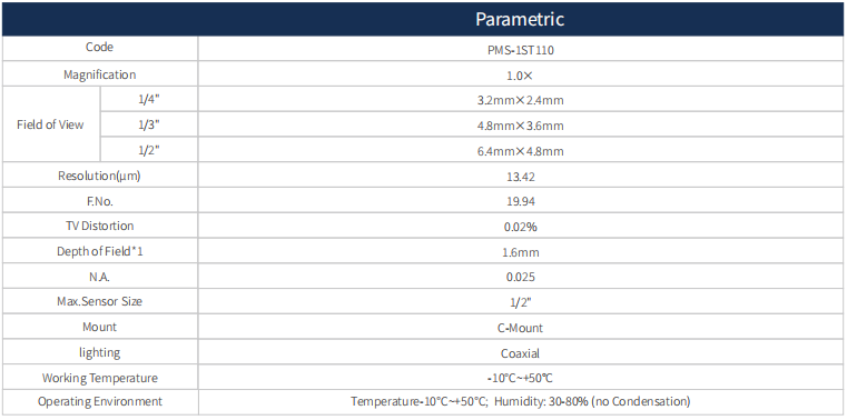 This Standard Telecentric Lens 1X, Max. sensor size 1/2", WD 110mm.