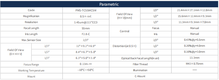 Telecentric Lens With 55mm Focal Length Parameter Table