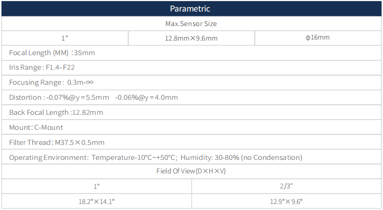 This 5MP 1" Machine Vision FA Lens. Focal length 35mm, Iris range F1.4-F22, Focusing Range 1m- ∞.