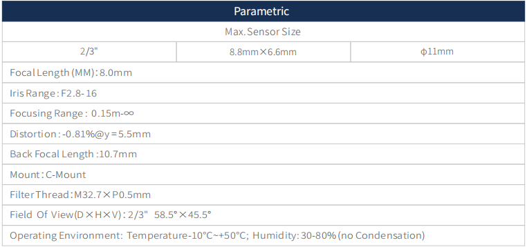 Focal length 8mm, Iris range F2.8-16, Focusing Range 0.15m- ∞, 10MP 2/3'' Machine Vision FA Lens, with Low distortion imaging, high resolution, sharp image and high contrast,