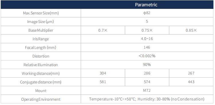 PMS-LLC075-14640M-M72 supports up to φ82mm image, ultra-low distortion, anti-vibration design, and standard magnification range 0.7X ~ 0.85X.