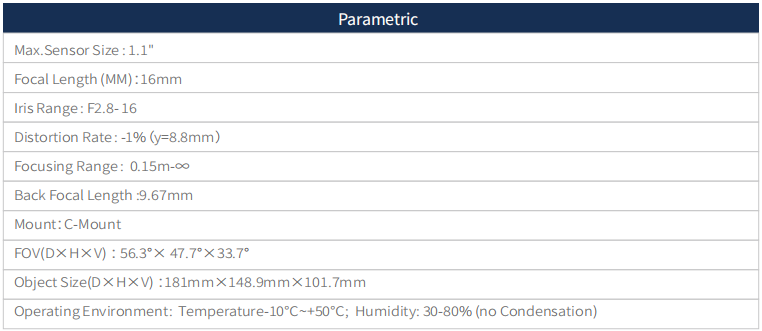 Focal length 16mm, Iris range F2.8-F22, 20MP1.1" Machine Vision FA Lens