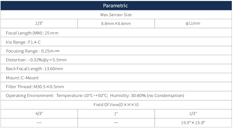 This 1.5MP 2/3’’ Machine Vision FA Lens, Focal length 25mm, Iris range F1.4-C, Focusing Range 0.25m- ∞.