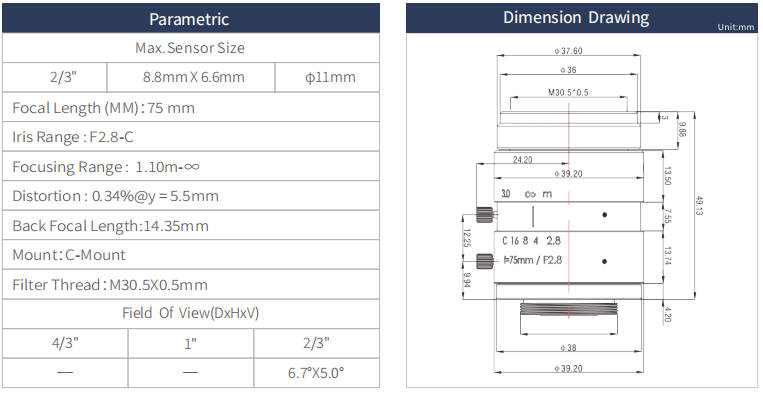 This 1.5MP 2/3" Machine Vision FA Lens, Focal length 75mm, Iris range F2.8-C, Focusing Range 1.1m- ∞.
