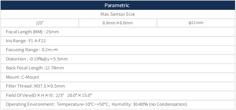 This 5MP 2/3’’ Machine Vision FA Lens, Focal length 25mm, Iris range F1.4-F22 Focusing Range 0.2m-∞.