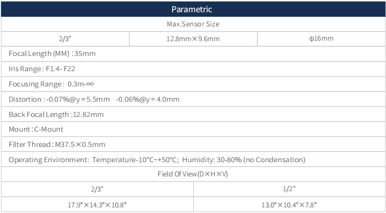 This 5MP 2/3" Machine Vision FA Lens, Focal length 35mm, Iris range F1.4-F22 Focusing Range 0.30m- ∞.