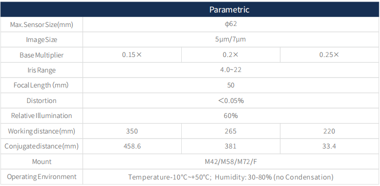 PMS-LLB02-5040M supports up to φ62mm image , ultra-low distortion, anti-vibration design, standard magnification range 0.15X ~ 0.25X.