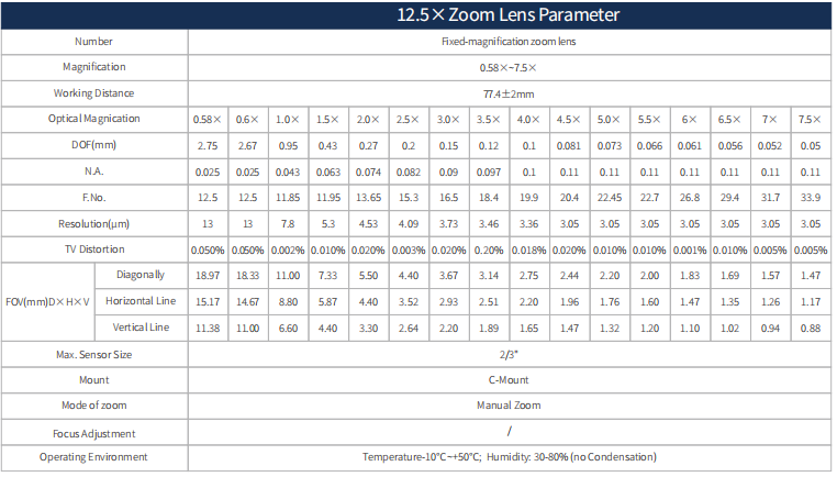 This 12.5X Detented Zoom Lens 12.5:1, 0.58X-7.5X, Max. sensor size 2/3", WD 77.4±2mm.