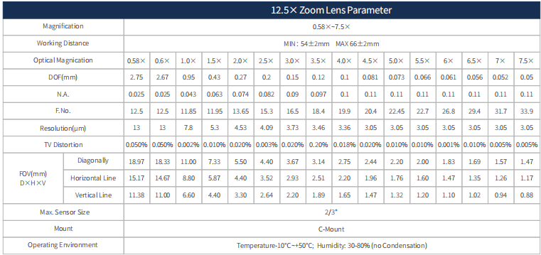 12.5X Motorized Zoom Lens with Coaxial Illumination and 3mm Fine Focus, 12.5:1, 0.58X-7.5X, Max. sensor size 2/3", WD 77.4±2mm. Super high magnification ratio and excellent optical performance.