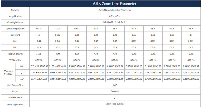 This 6.5X Zoom Lens with 3mm Fine Focus 6.5:1, 0.7X-4.5X, Max. sensor size 2/3", WD 87±2mm.