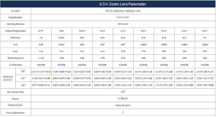 6.5X Continuous Zoom Lens Parameter Table