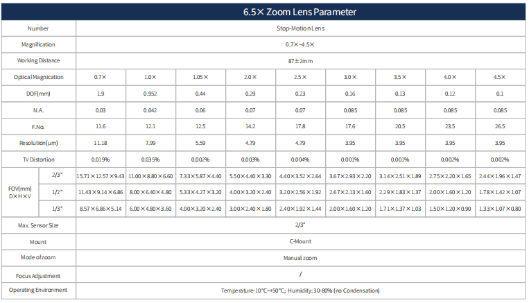 6.5X Continuous Zoom Lens Parameter Table
