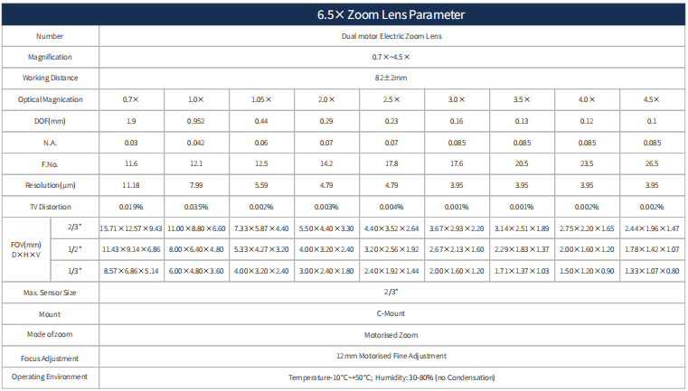This 6.5X Motorized Zoom Lens, 6.5:1, 0.7X-4.5X, Max. sensor size 2/3", WD 82±2mm.