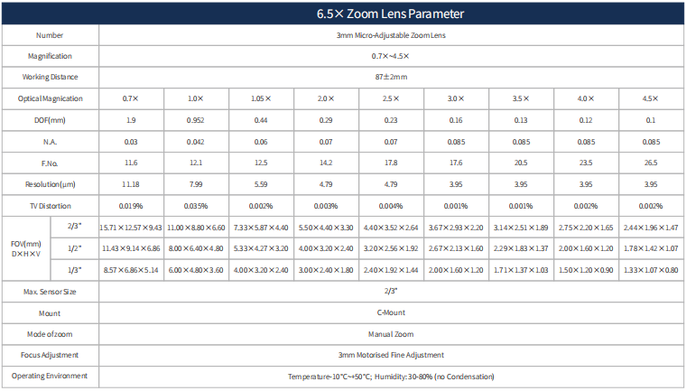 This 6.5X fixed ZOOM LENS offers a 6.5:1 magnification range with 3mm micro-adjustment capability, covering 0.7X to 4.5X magnification. It supports sensors up to 2/3" in size and provides a working distance of 87±2mm.