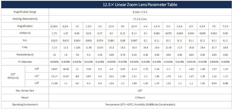 12.5X linear Zoom Lens Parameter Table