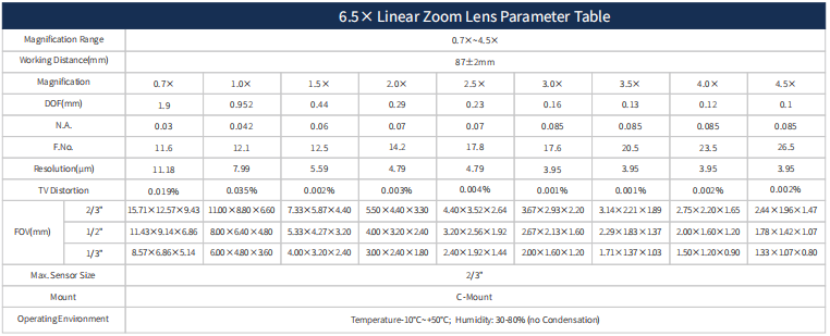 This 6.5X Linear Zoom Lens 6.5:1, 0.7X-4.5X, Max. sensor size 2/3", WD 87±2mm.