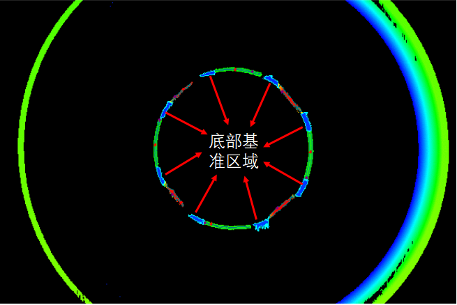 In the front-view inspection, a reference plane is first established by fitting the blue area on the bottom surface, which serves as the reference standard for subsequent measurements. The red area represents the high protrusions; by precisely measuring the height from the high protrusions to the reference plane using sensors, it is determined whether they meet the design requirements. The green area indicates low protrusions, and their height relative to the reference plane is measured in the same manner. Additionally, the center coordinates are calculated based on the outer circular contour, and the distance from the center of each protrusion to the center is then calculated to determine whether the protrusions are misaligned. This multidimensional inspection method enables a comprehensive and accurate assessment of the quality of the front-facing components.
