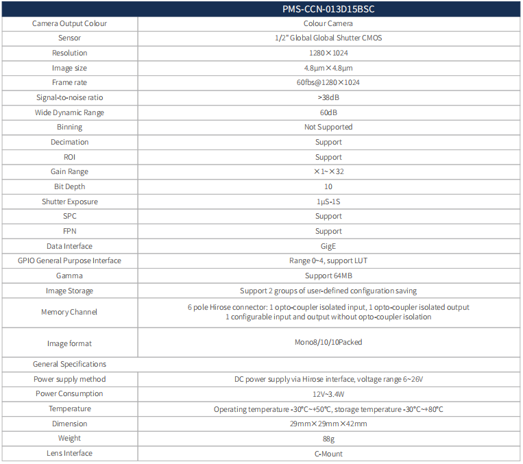 This 1.3MP Gigabit Industry Camera, 1280x1024, output color is mono, support CCD sensor 1/2", C-mount.