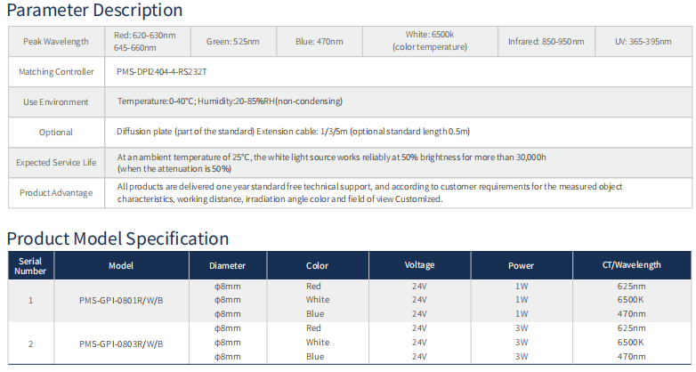 Point light source has the advantages of high brightness and small luminous area. Point light source with the diameter of 8mm or 9mm at the top and 6mm at the luminous surface can be used alone in the machine vision system, and can also be used with the micro lens or telecentric lens with coaxial function.
