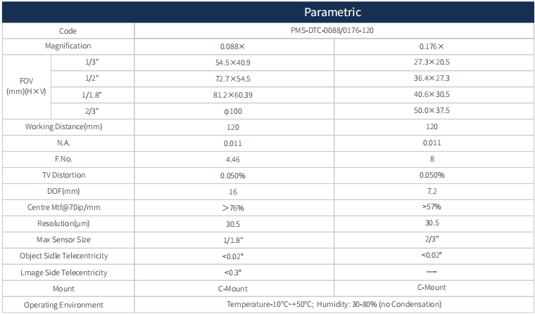 1. Double port, bi-telecentric, almost without deviation when used for measurement.