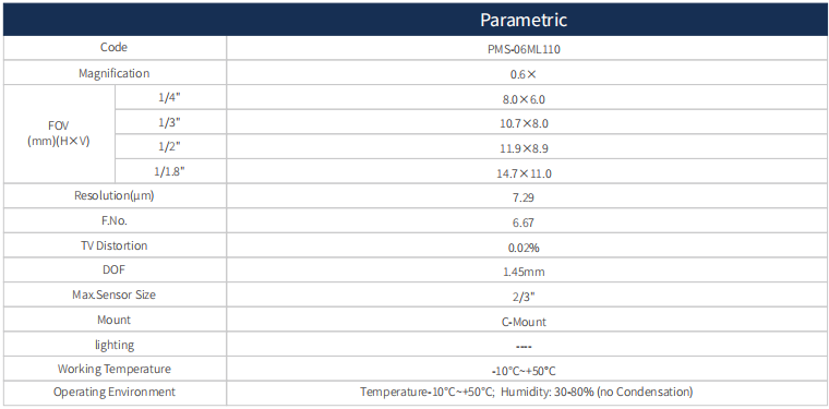 This Macro Telecentric Lens 0.6X, Max. sensor size 2/3", WD 110mm.