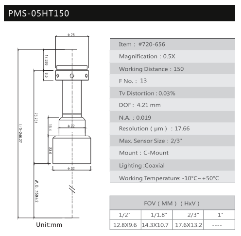This High Resolution Telecentric Lens 0.5X, Max. sensor size 2/3", WD 150mm.