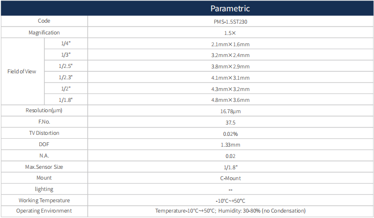 This Standard Telecentric Lens 1.5X, Max. sensor size 1/1.8", WD 230mm.