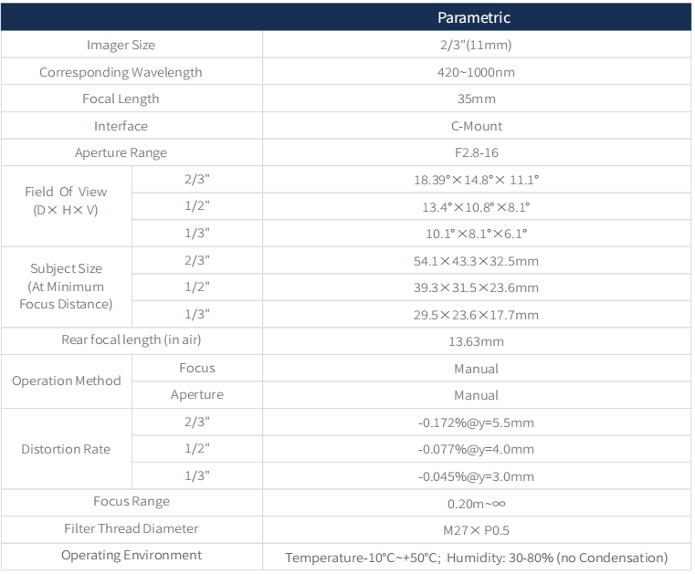 Focal length 35mm, Iris range F2.8-F16, Focusing Range 0.2m- ∞, 10MP 2/3'' Machine Vision FA Lens, with Low distortion imaging, high resolution, sharp image and high contrast,