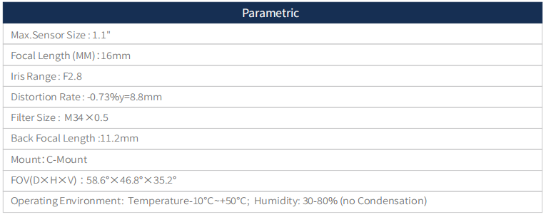 Focal length 16mm, Iris range F2.8, Focusing Range 0.1m- ∞, 20MP1.1" Machine Vision FA Lens
