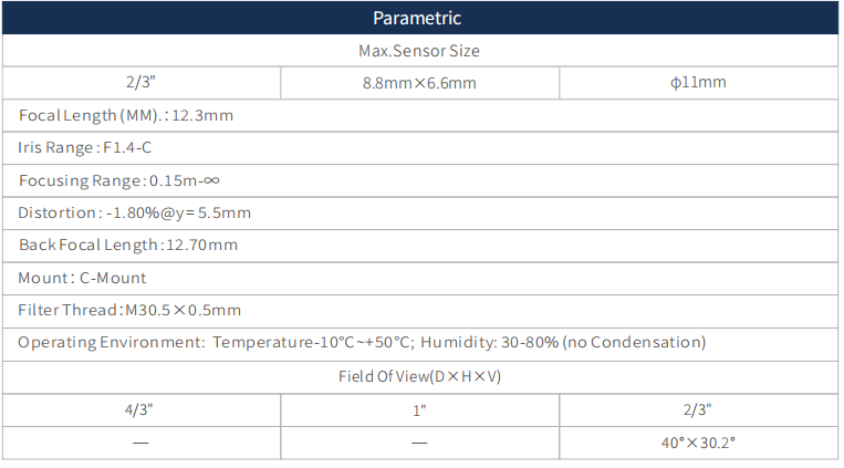 This 1.5MP 2/3" Machine Vision FA Lens, Focal length 12.3mm, Iris range F1.4-C, Focusing Range 0.15m- ∞.
