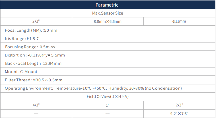 This 1.5MP 2/3" Machine Vision FA Lens, Focal length 50mm, Iris range F1.8-C, Focusing Range 0.50m- ∞.