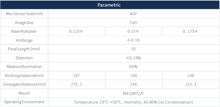 POMEAS 4K line-scan lens supports up to φ32mm image, ultra-low distortion, anti-vibration design, and standard magnification range 0.125~0.175X.
