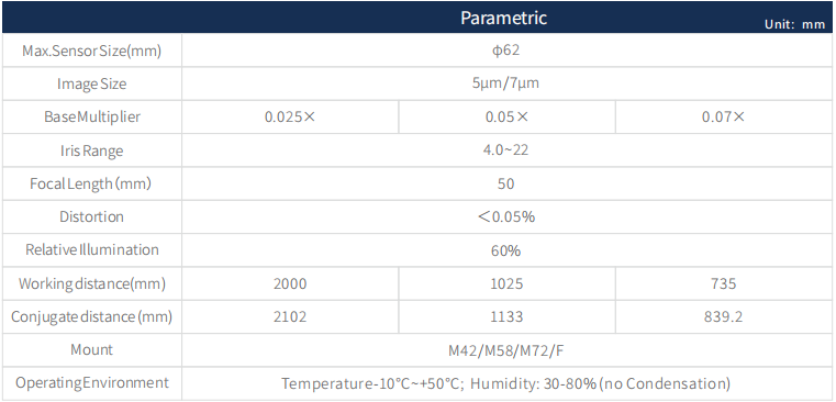 POMEAS PMS-LLB005-5040M Line Scan Lens supports up to φ62 image, ultra-low distortion, anti-vibration design, standard magnification range 0.025X~0.07X