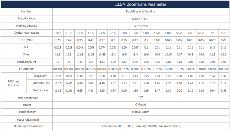 This 12.5X Continuous Zoom Lens 12.5:1, 0.58X-7.5X, Max. sensor size 2/3", WD 77.4±2mm.