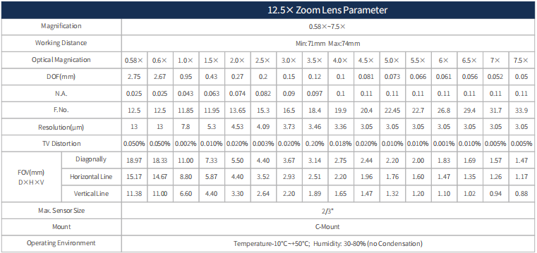 This 12.5X Zoom Lens with 3mm Fine Focus. 12.5:1, 0.58X-7.5X, Max. sensor size 2/3", WD 77.4±2mm.