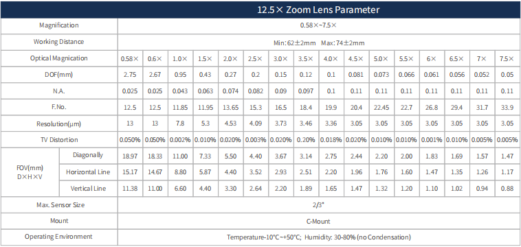 This 12.5X Detented Zoom Lens with Coaxial illumination and 12mm Fine Focus, 12.5:1, 0.58X-7.5X, Max. sensor size 2/3", WD 77.4±2mm.