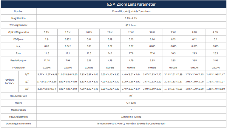 6.5X Continuous Zoom Lens Parameter Table