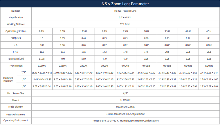 This 6.5X Motorized Zoom Lens with 3/12mm Fine Focus, 6.5:1, 0.7X-4.5X, Max. sensor size 2/3", WD 87±2mm.