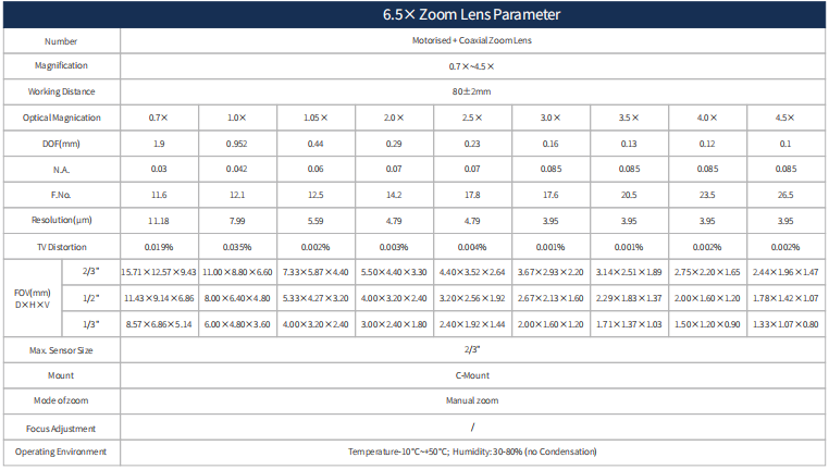 This 6.5X Motorized Zoom Lens with Coaxial Illumination 6.5:1, 0.7X-4.5X, Max. sensor size 2/3", WD 82±2mm.