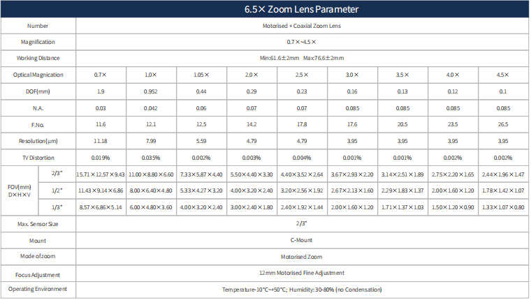 This 6.5X Motorized Zoom Lens with Coaxial Illumination 6.5:1, 0.7X-4.5X, Max. sensor size 2/3", WD 70-82mm.