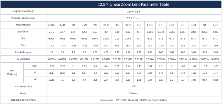 This 12.5X linear Zoom Lens 12.5:1, 0.58X-7.5X, Max. sensor size 2/3", WD 77.4±2mm.