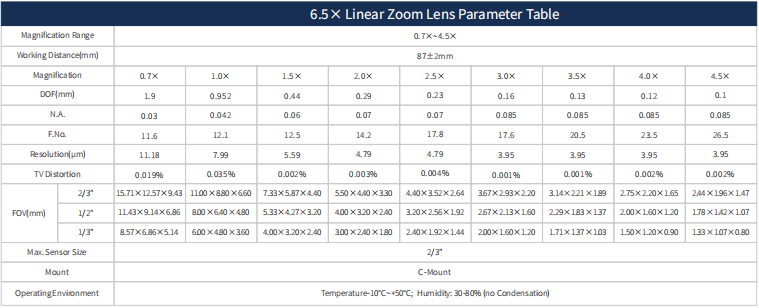 6.5X linear Zoom Lens Parameter Table