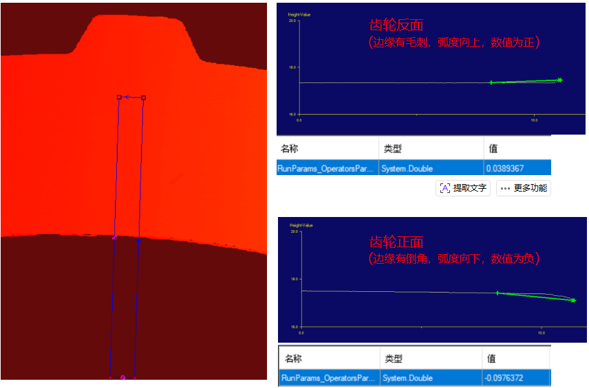 3. Curvature Calculation and Front/Back Determination: Based on the extracted contour data, the direction of the edge curvature is calculated. According to preset rules, the curvature of the front edge is negative, while that of the back edge is positive, thereby accurately distinguishing between the front and back sides of the gear.