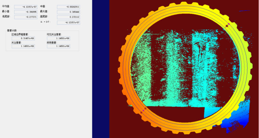 2. Data Processing and Flatness Calculation: Using advanced image processing algorithms, the gear surface is identified and a reference plane is fitted. The height difference between each point on the gear surface and this reference plane is calculated. The flatness data of the gear surface is then derived by statistically analyzing the difference between the highest and lowest values. This method effectively eliminates the influence of local outliers, thereby improving measurement accuracy.