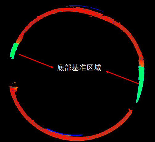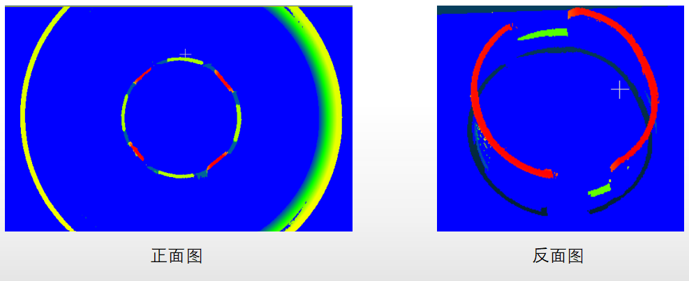 In the front-view inspection, a reference plane is first established by fitting the blue area on the bottom surface, which serves as the reference standard for subsequent measurements. The red area represents the high protrusions; by precisely measuring the height from the high protrusions to the reference plane using sensors, it is determined whether they meet the design requirements. The green area indicates low protrusions, and their height relative to the reference plane is measured in the same manner. Additionally, the center coordinates are calculated based on the outer circular contour, and the distance from the center of each protrusion to the center is then calculated to determine whether the protrusions are misaligned. This multidimensional inspection method enables a comprehensive and accurate assessment of the quality of the front-facing components.
