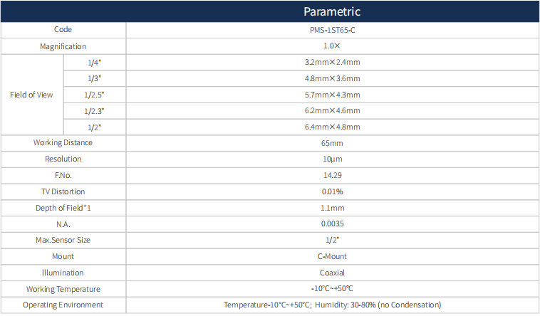 This Coaxial Standard Telecentric Lens 1X, Max. sensor size 1/2", WD 65mm.