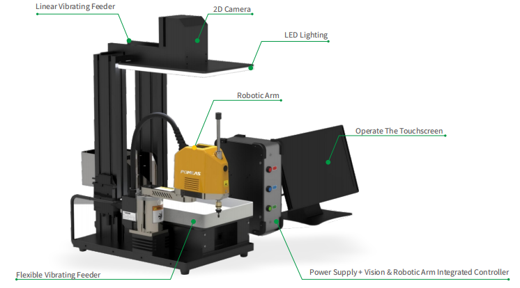 The compact SCARA flexible loading machine is a highly efficient automated feeding system integrating vision and robotic arm operation. It can simultaneously perform precise identification and loading of multiple materials with varying shapes, sizes, and materials. Its compact design makes it suitable for confined spaces.