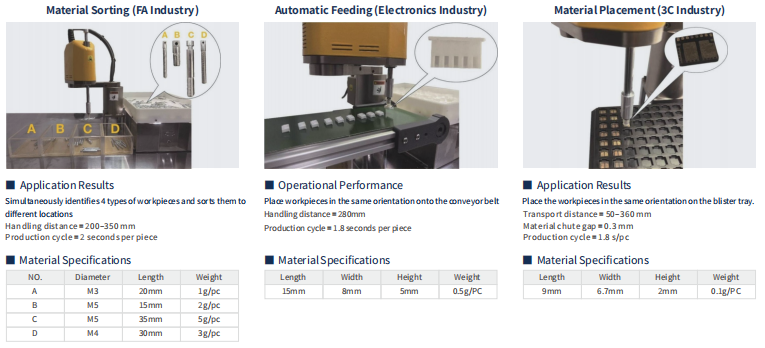 Simultaneously identifies and sorts 5 types of workpieces, with a production cycle time of 1.8–2.5 seconds per piece (including vibration and image capture time).
